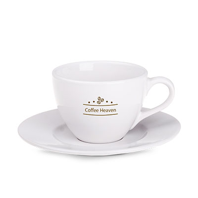 A ceramic advertising cup that features a classic, oval shape.