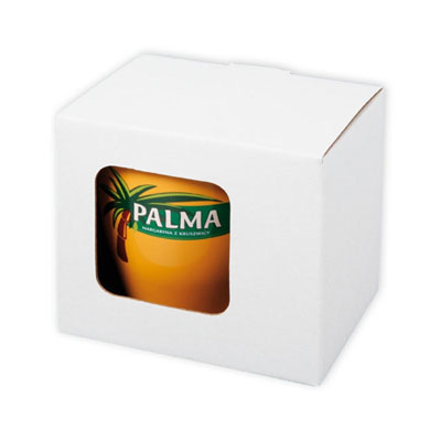 Packaging with an opening showing imprint on the mug from the drinker side.