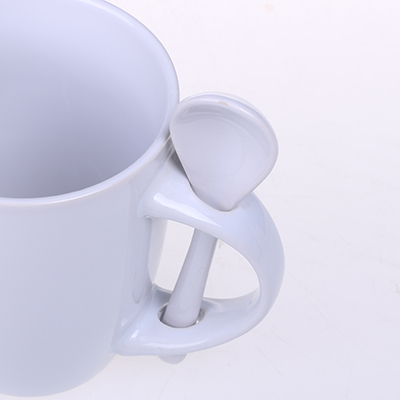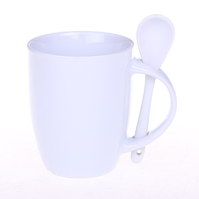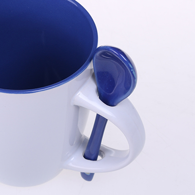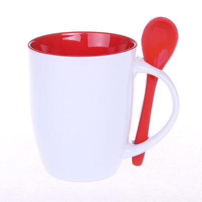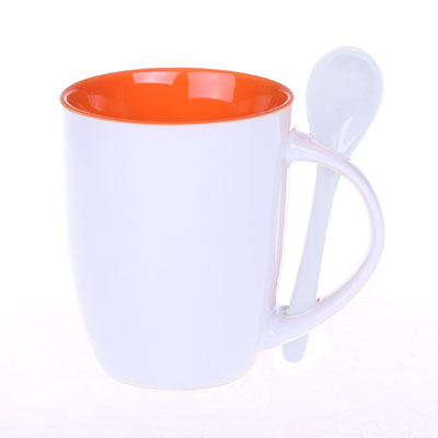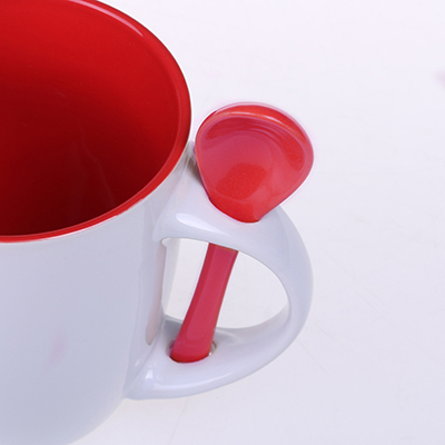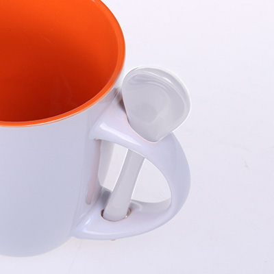 An advertising mug with colorful inside and white external glaze. The set includes a ceramic spoon. Unique handle shape allows for storing of the spoon. This product is from the end of a series and may have pinholes, dots, and variations in glaze shade.