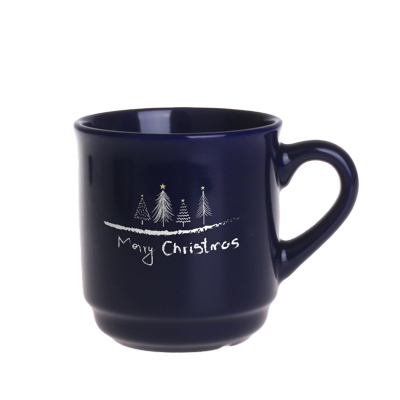 A mug developed for Christmas markets. It has a classic handle shape and a straight body, allowing for stacking. The mug has a trait marker showing the capacity of 200ml and the mark of the entity responsible for marketing. The markings comply with the requirements of the European Union