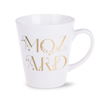 A capacious advertising mug with conoid sides, widening towards the top and wit a classic handle. A popular model in ceramic version. This product is from the end of a series and may have pinholes, dots, and variations in glaze shade.
