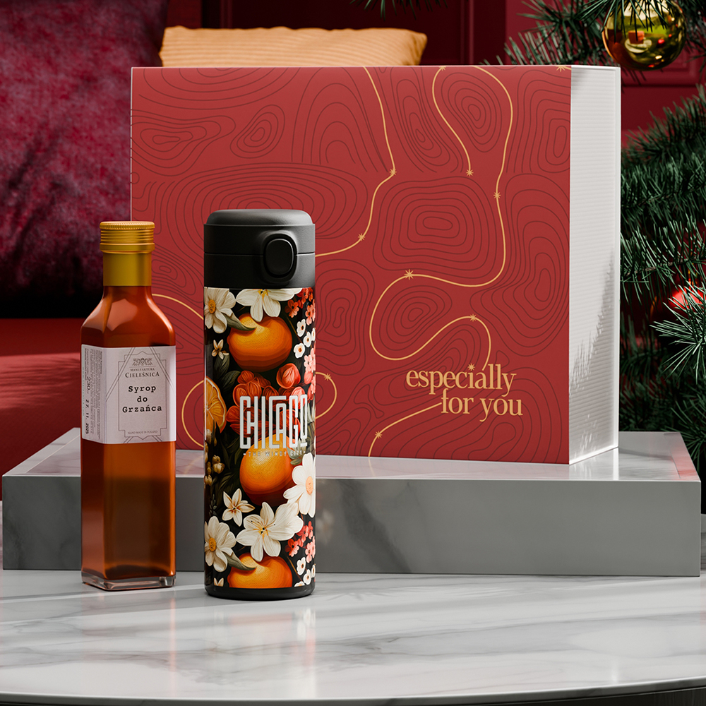 A perfect warming set for your adventures – featuring the Orion thermal mug, ideal for refined decorations, and a spiced mulled wine-style syrup full of aromatic spices to enrich the flavor of tea, coffee, red wine, or desserts. The set is packed in dedicated eco-friendly Snowy packaging and finished with an elegant personalized band. THE PRESENTED DECORATION IS FOR ILLUSTRATION PURPOSES ONLY AND IS NOT INCLUDED IN THE PRODUCT PRICE. THE SET IS AVAILABLE IN DEDICATEDSNOWY PACKAGING WITH A SELECTED DECORATION OPTION.