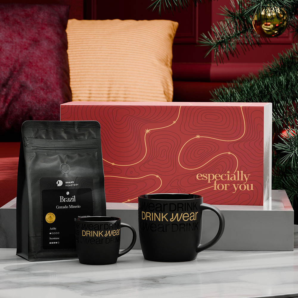 One of the top sales hits – the black matte Handy Supreme mug accompanied by its smaller version, Small, perfect for espresso, and carefully selected Arabica Brazil Cerrado Mineiro coffee beans. The set is packed in dedicated eco-friendly Merry packaging and finished with an elegant personalized band. THE PRESENTED DECORATION IS FOR ILLUSTRATION PURPOSES ONLY AND IS NOT INCLUDED IN THE PRODUCT PRICE. THE SET IS AVAILABLE IN DEDICATED MERRY PACKAGING WITH A SELECTED DECORATION OPTION.