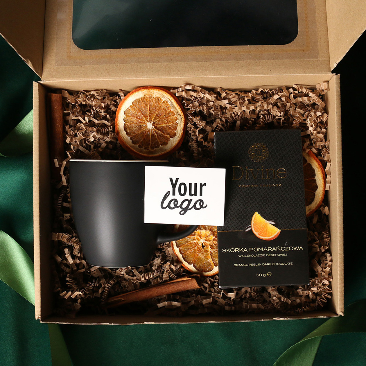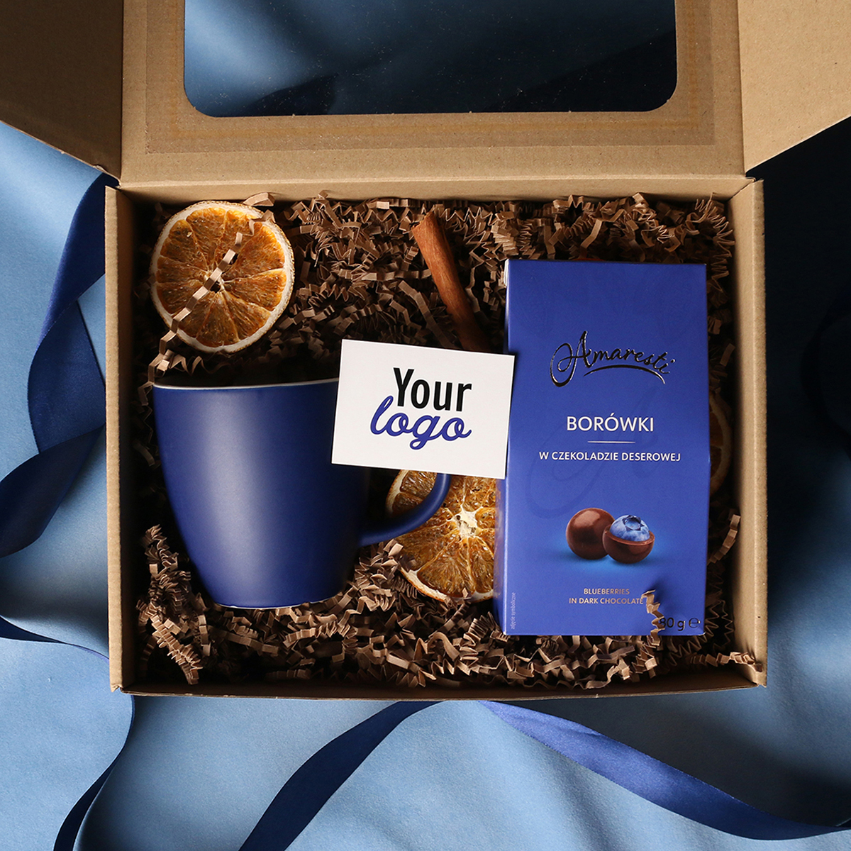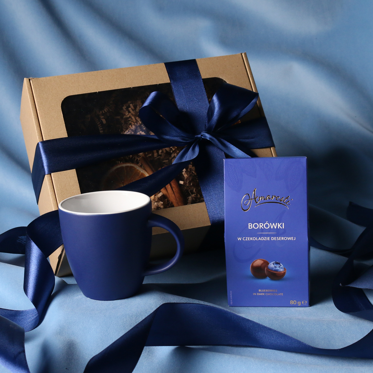 The set includes: Fiord mug red-white / navy-white / black-white with the option of customization, Divine Pralines – cranberries in chocolate (red) / blueberries in chocolate (navy) / orange peel in chocolate (black). All packed in a stylish eco cardboard box with a window. Additional customization options: print on the mug, company logo tag, ribbon or sleeve with a winter theme enriched with gold stamping.