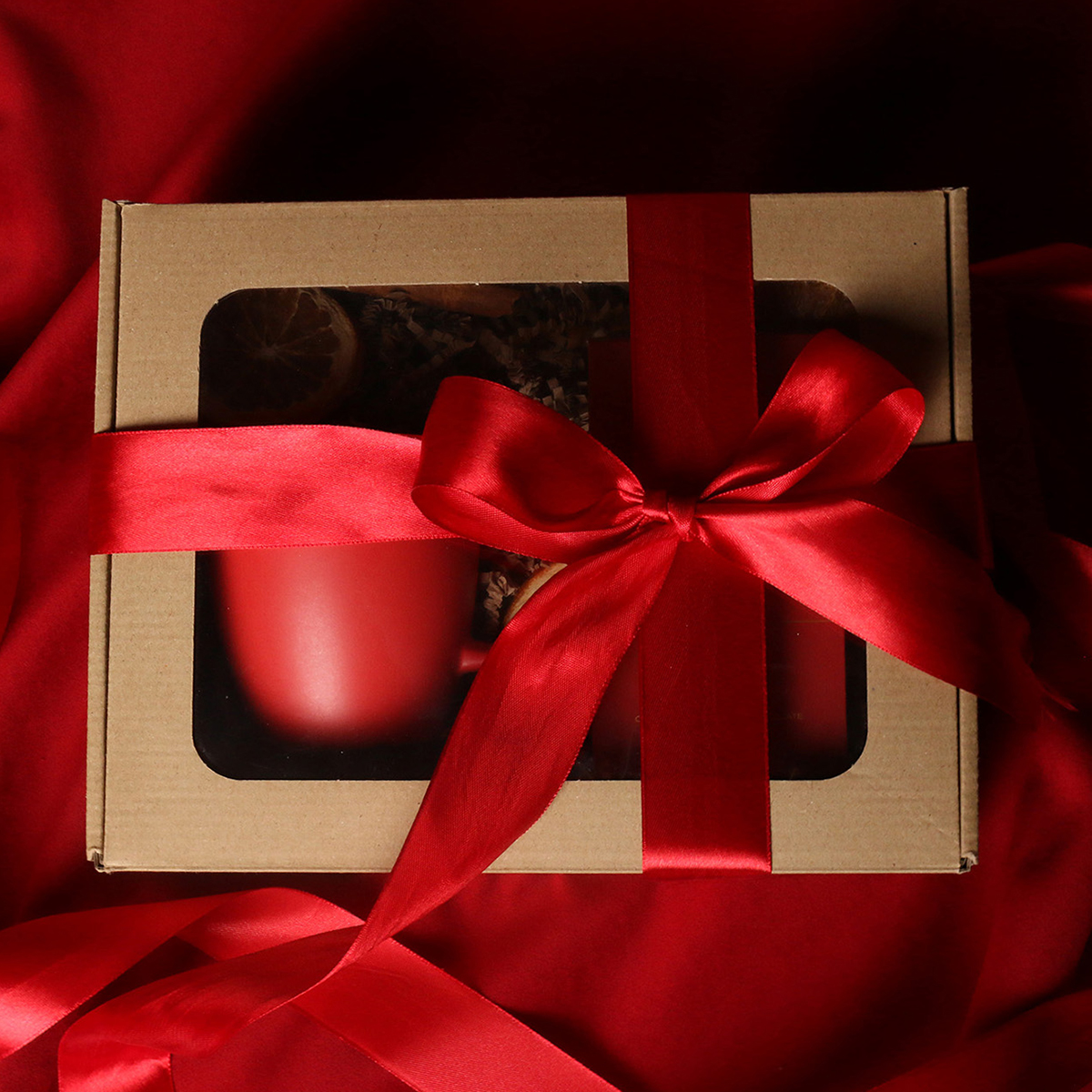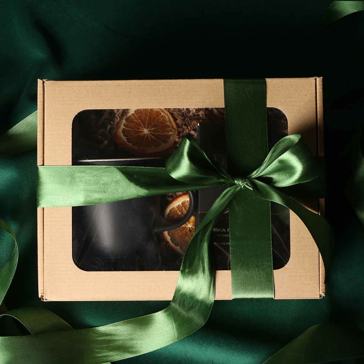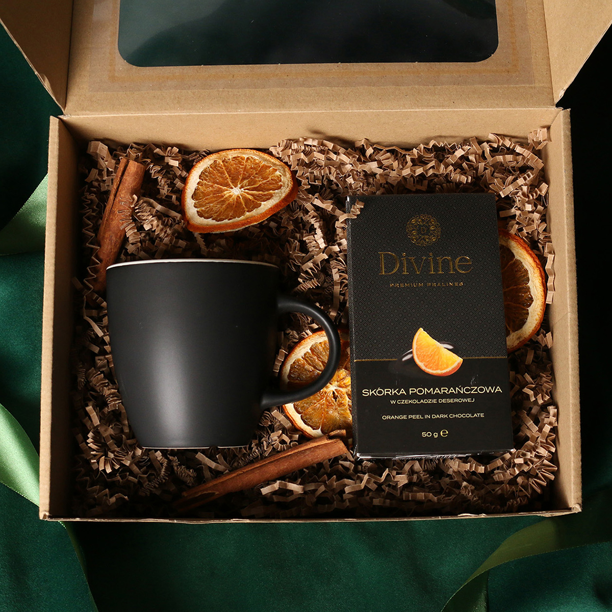 The set includes: Fiord mug red-white / navy-white / black-white with the option of customization, Divine Pralines – cranberries in chocolate (red) / blueberries in chocolate (navy) / orange peel in chocolate (black). All packed in a stylish eco cardboard box with a window. Additional customization options: print on the mug, company logo tag, ribbon or sleeve with a winter theme enriched with gold stamping.