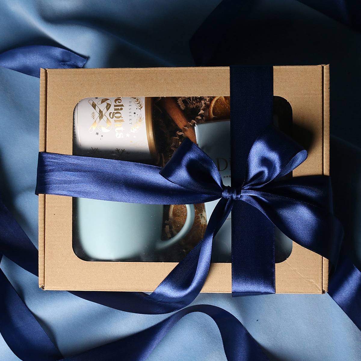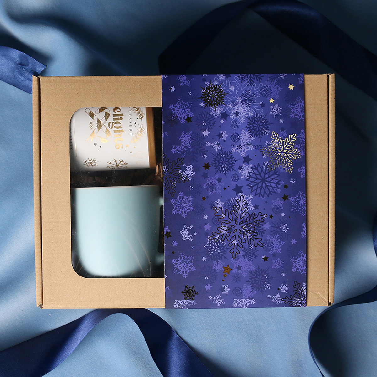 The set includes: Handy Velvet mug rose pink-white / baby blue-white / Handy Cool gray-white with the option of customization, Divine Pralines – almonds in chocolate with raspberry powder (pink) / almonds in chocolate with coconut (blue) / orange peel in dark chocolate (gray), Dessert Delights – blackcurrants in white chocolate with raspberry powder packed in a tube with a winter theme. All packed in a stylish eco cardboard box with a window. Additional customization options: print on the mug, company logo tag, ribbon or sleeve with a winter theme enriched with gold stamping.
