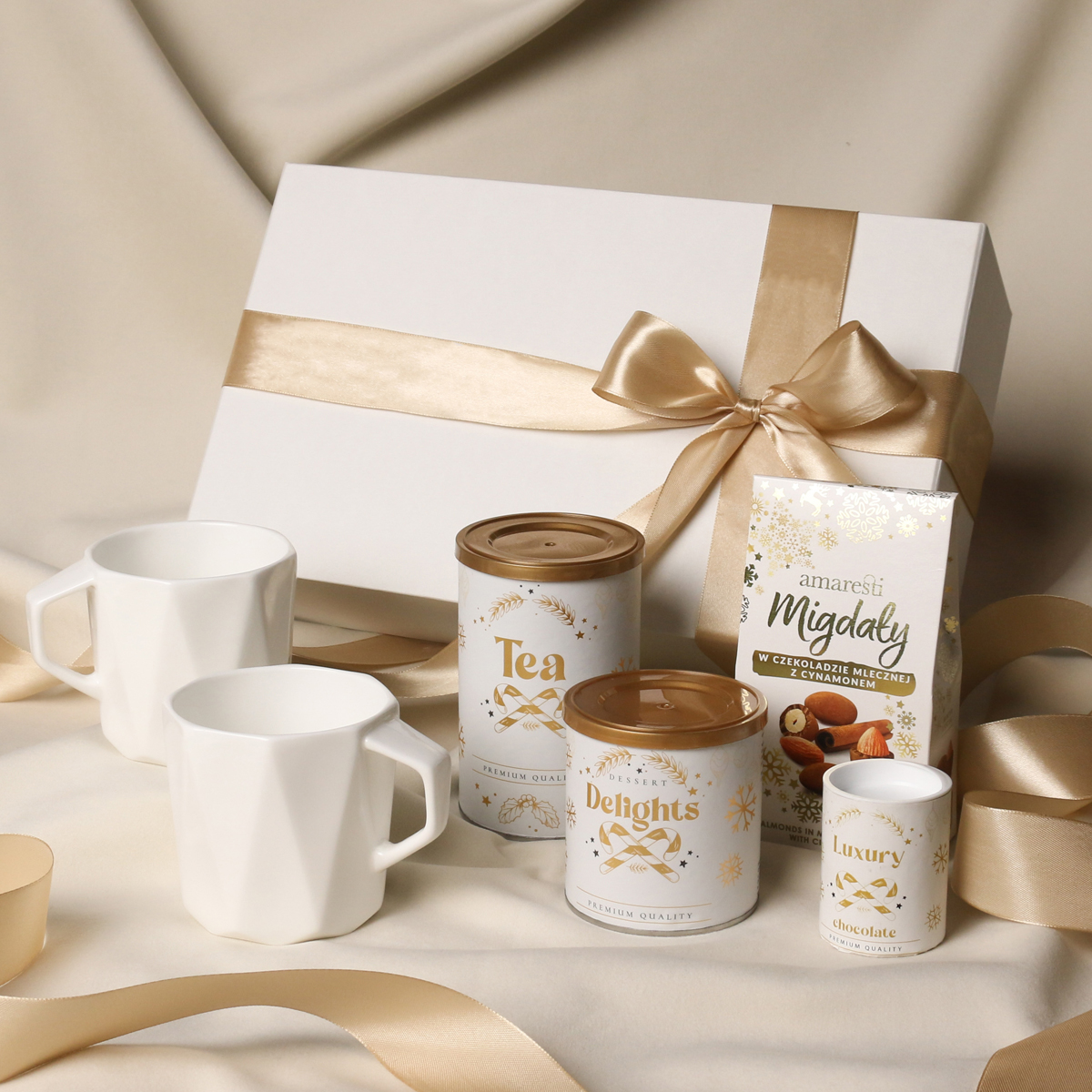 Exclusive Fine Bone China porcelain mugs – Crown – 2 pcs Sweet almonds in milk chocolate with cinnamon Delicate Delights Pralines – blackcurrant in white chocolate with raspberry powder 80g Aromatic green Sencha tea with cherries, rose petals, and ginkgo biloba leaves 80g Exclusive magnet-closure packaging with the option to add a matching ribbon and banderole