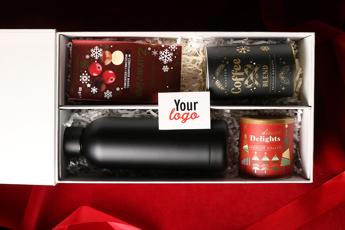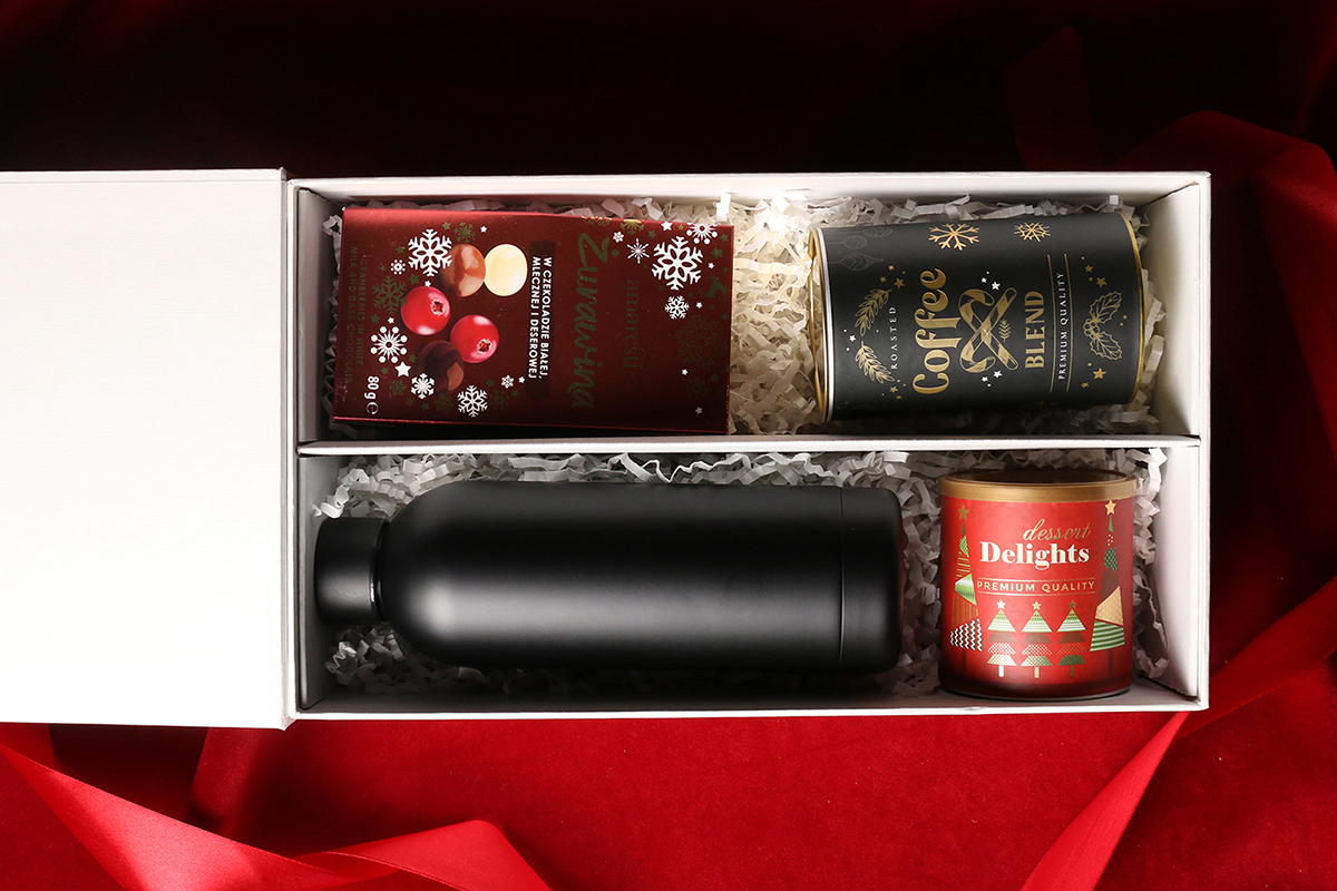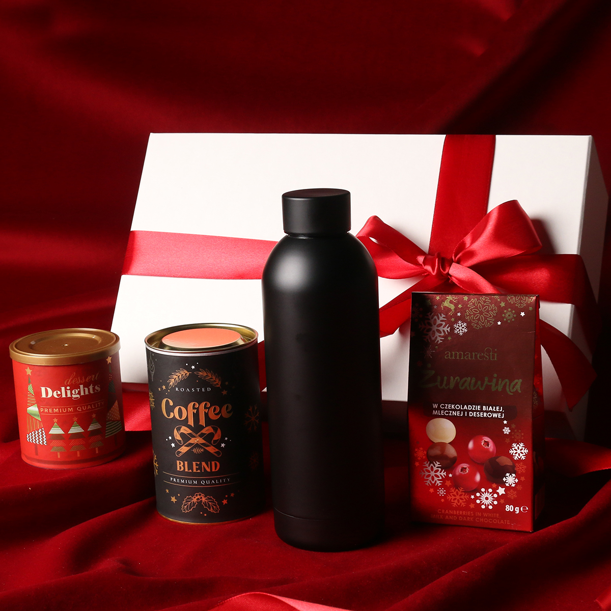 Practical black Apollo thermal bottle Cranberry pralines in white, milk, and dark chocolate Aromatic Arabica Brazil Cerrado Mineiro coffee beans in a 150g tin Delicate Delights Pralines – blackcurrant in white chocolate with raspberry powder 80g Exclusive magnet-closure packaging with the option to add a matching ribbon and banderole